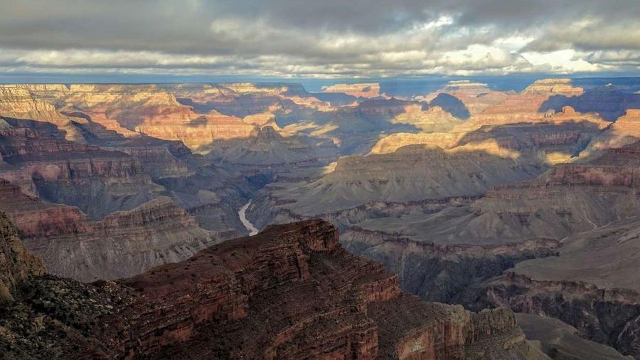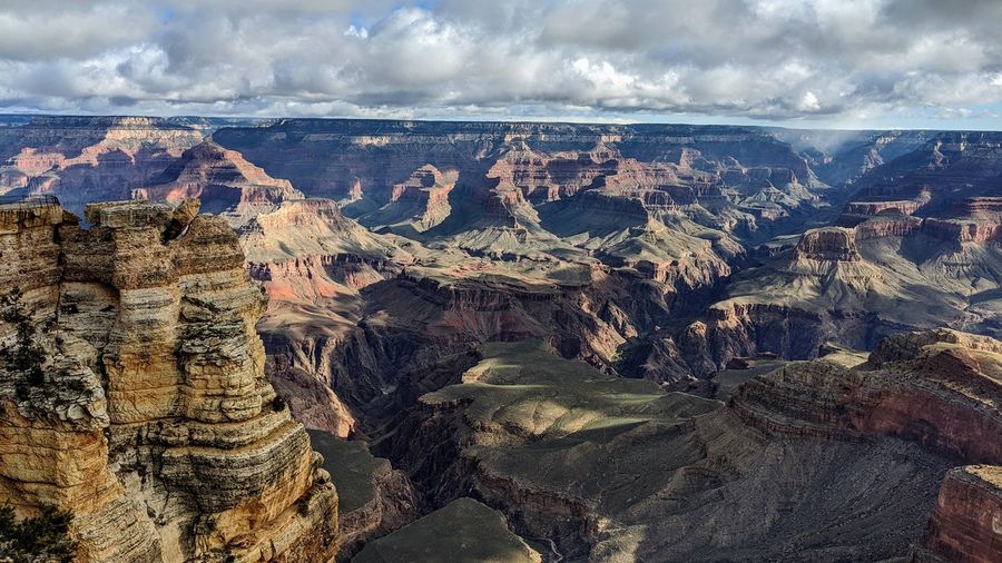 The first viewpoint most visitors see and arguably the best. A wide plaza with unobstructed views into the canyon, across to the North Rim, and down to the Colorado River on clear days. The canyon is 10 miles wide and a mile deep here. No photograph prepares you for the scale.