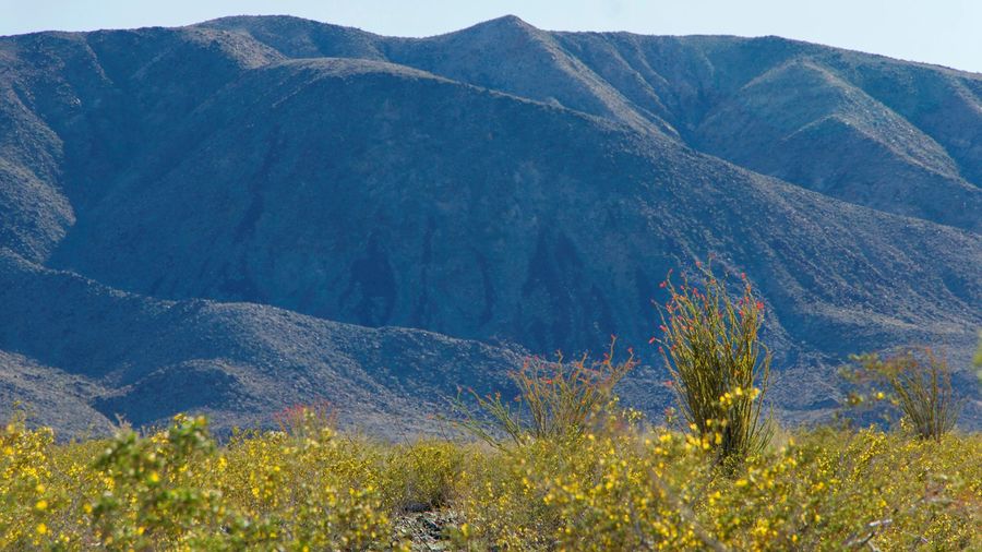 Pullout with views of ocotillo cacti and the Pinto Basin. A different desert character than the Mojave side.
