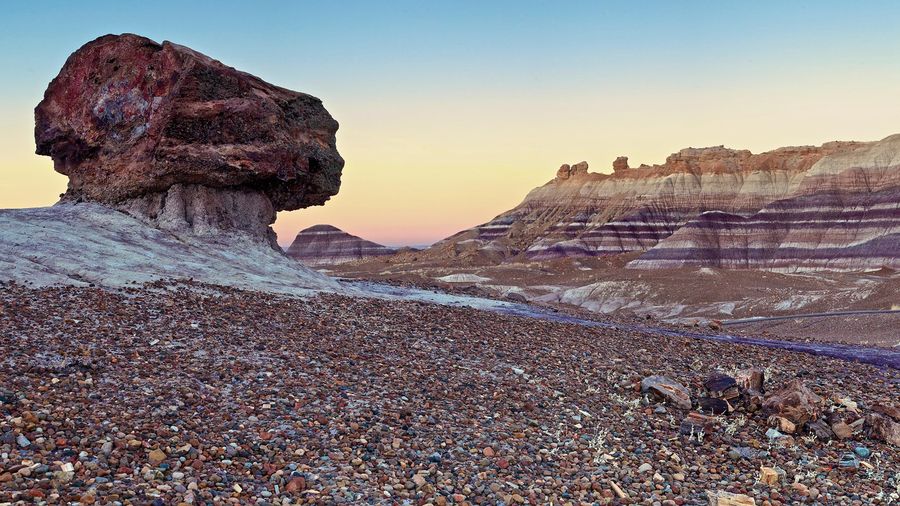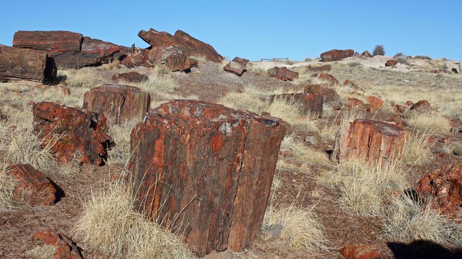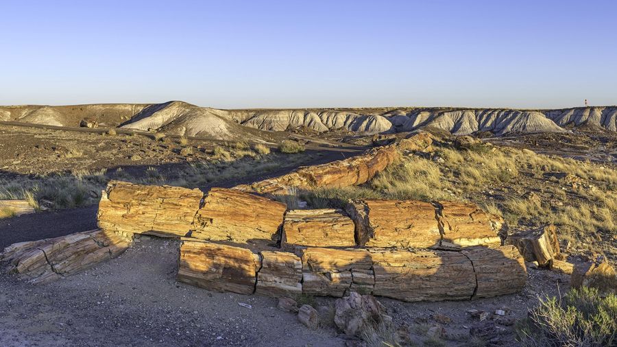 A 0.75-mile paved loop through one of the densest concentrations of petrified logs in the park. Massive sections of crystallized trees lie scattered on the desert floor, some over six feet in diameter. The colors in the wood, from deep reds to purples, come from different minerals absorbed during fossilization.
