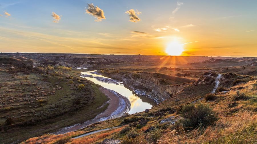 Theodore Roosevelt National Park straddles I-94 in western North Dakota, making it the most convenient national park for cross-country drivers on the northern route. The South Unit entrance is in Medora, right off the interstate. These badlands are smaller and more colorful than South Dakota's, with bison, wild horses, and the Little Missouri River winding through painted canyons. Young Theodore Roosevelt came here in 1883 to hunt bison and stayed to become a rancher. He later said these years shaped the conservation president he became. One hour gives you the scenic loop drive, a few overlooks, and maybe a bison encounter.